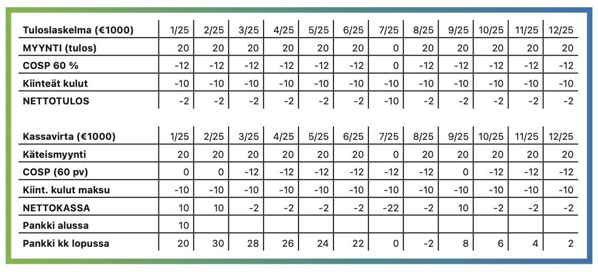 Yritys tuottaa tappiota, vaikka kassavirta ja maksuvalmius ovat kunnossa kesään asti. Pankkitili vähenee säännöllisesti. Vaikka ei tässä, niin käytännössä kannattavuusongelma peittyy kassavirtaa tarkasteltaessa usein sillä, että yritys jonain kuukausina tekee myös voittoa, joka voi väliaikaisesti parantaa kassavirtaa. Tässä tapauksessa tavarantoimittajat rahoittavat yrityksen tappiollista toimintaa. Yritys tekee vuodessa 32 t euroa tappiota ja tappio alkaa realisoitua heikentyneenä kassana vasta heinäkuussa ja siitä eteenpäin. Vuoden lopussa yrityksellä on kassassa 2 tuhatta euroa ja 24 tuhatta ostovelkoja sekä kulutettu alkukassa 10 t = muutos vuodessa kassavirrassa -32 tuhatta ja tämä on myös yrityksen tappio yhteensä 32 t. Pieni muutos kuukausittain on iso muutos vuositasolla. Suurin näköharha syntyy siitä, kun yritys saa suuria ennakoita ja kulut tulevat myöhemmin. Tämä osoittaa, että yritys tarvitsee myös tuloslaskelman. Jos yritys toimii puoli vuotta siinä uskossa, että kaikki on hyvin kassavirran perusteella. Tämä on kallista aikaa olla sopeuttamatta toimintaansa.