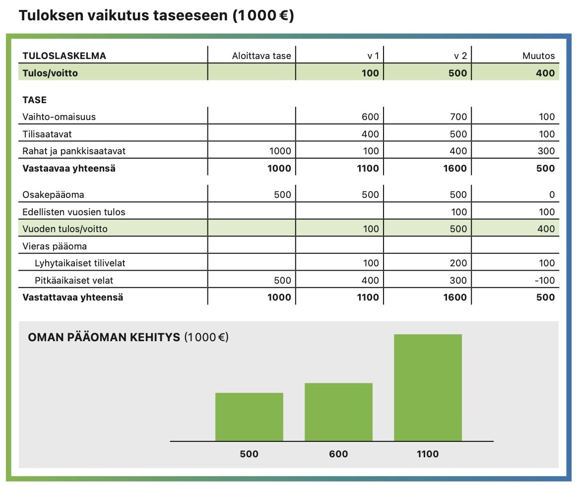 Yrityksen ainoa tapa toiminnallaan luoda pääomia on tehdä voittoa. Alla oleva taulukko kuvaa hyvin tuloksen vaikutusta taseeseen. Voitto ei ole sama kun raha mutta tulos kertoo kuinka paljon enemmän tuottoa on tullut kuluihin nähden. Tasemuutokset kertovat miten voitto on vaikuttanut taseeseen. Harvoin voitto lisää vaan kassaa koko voitolla vaan yleensä voitto jakautuu eri tase-eriin ja vähentää myös velkaa. Mutta voitto parantaa selkeästi aina yrityksen avainlukuja ja siksi se on pohjana luottoluokittajille ja muille sidosryhmille kuitenkin vuositrendeinä enemmän kuin yksittäisenä vuotena yhdessä muiden avainlukujen kanssa.
