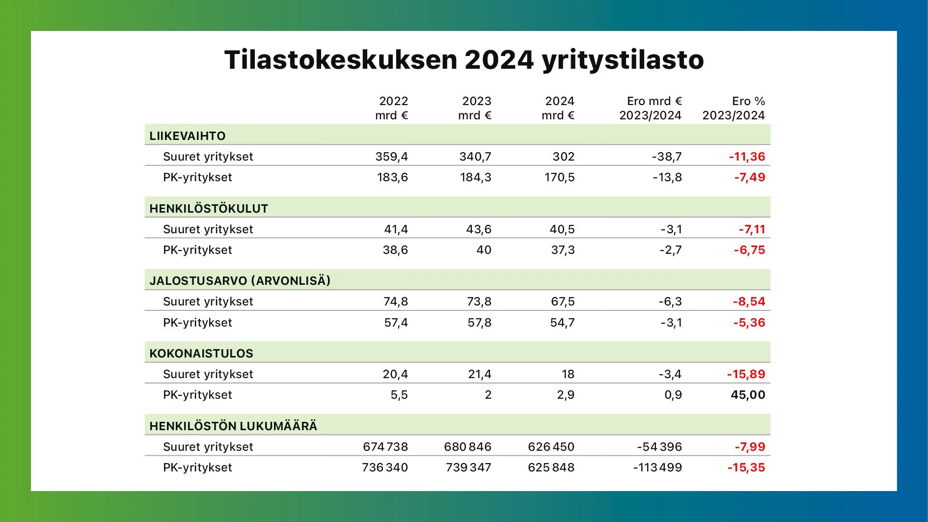 Suurten yritysten liikevaihto on laskenut −11,36 % (340,7 → 302 mrd €).